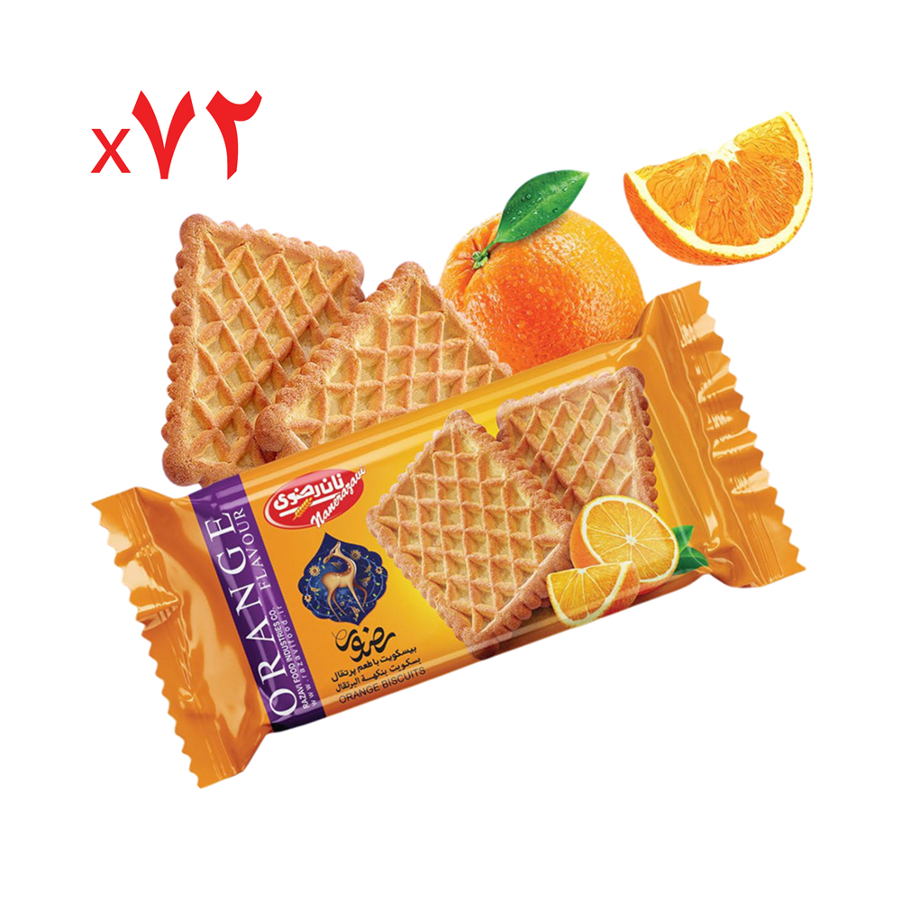 بیسکویت نیم چاشت با طعم پرتقال نان رضوی 33 گرم – کارتن 72 عددی